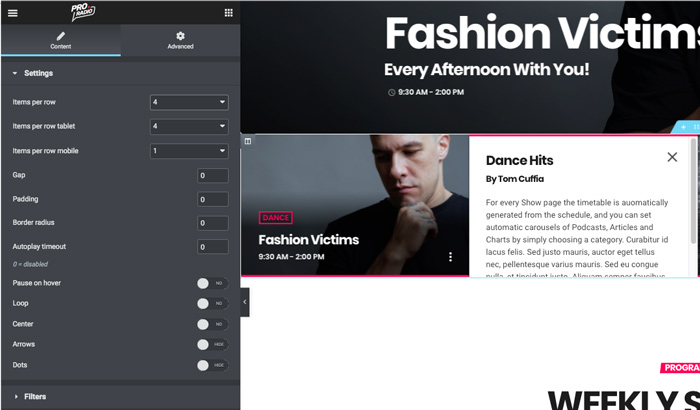 The “Upcoming Shows Carousel” included in the Pro Radio WordPress Theme can automatically display the current and upcoming shows, extracting the results from the schedule of the current day. Multiple design settings will add a huge design flexibility to obtain very different results to match any layout, such as items per row, gaps, radius and more