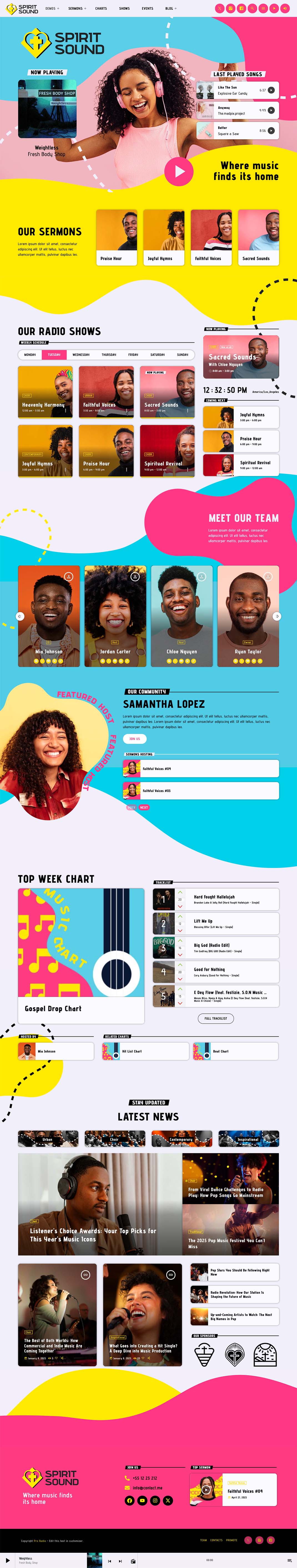 Built with clean layouts, bright color accents, and the cheerful Advent Pro font, Spirit Sound perfectly captures the spirit of Gospel broadcasting. Every detail, from the dynamic homepage to the fully equipped internal pages, is designed to celebrate community, worship, and music with energy and warmth.
