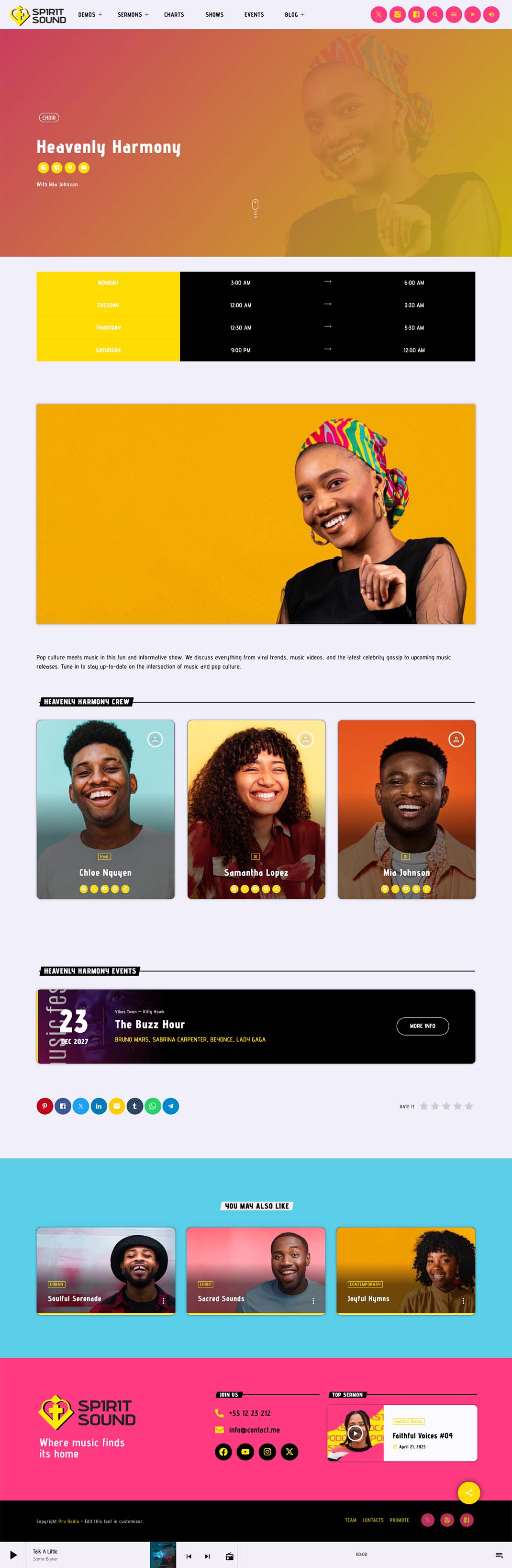 Spirit Sound is the vibrant and joyful website template crafted especially for Gospel radio stations, faith-based online stations, and inspirational podcasts. With its colorful design and uplifting vibe, Spirit Sound helps you bring your message of hope and positivity to audiences around the world.