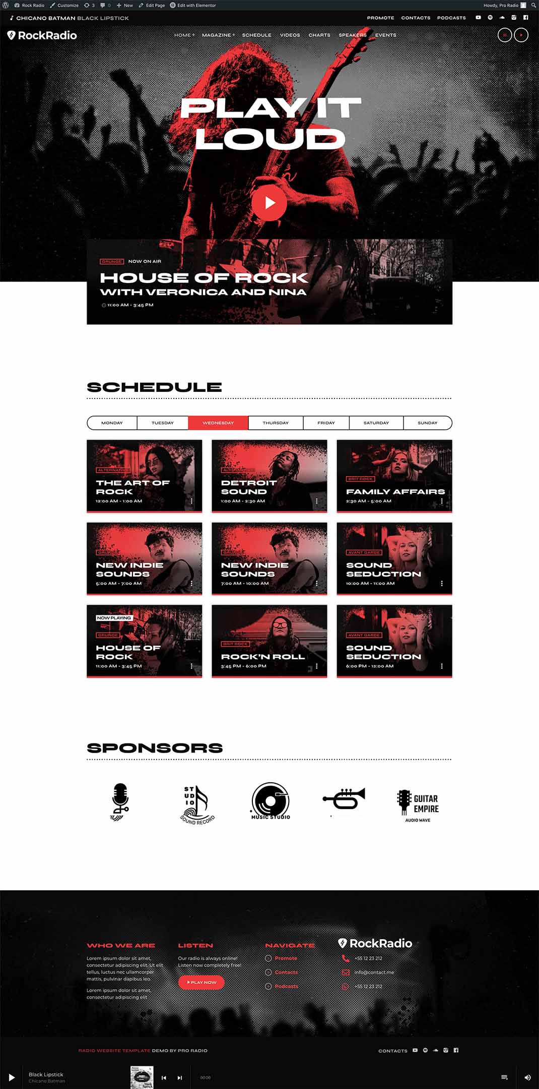 The demo is provided with the original PSD templates, to easily create your own images in the same style and colors as the demo. Create from scratch a super professional Rock and Metal radio station! Only with Pro Radio theme for WordPress!