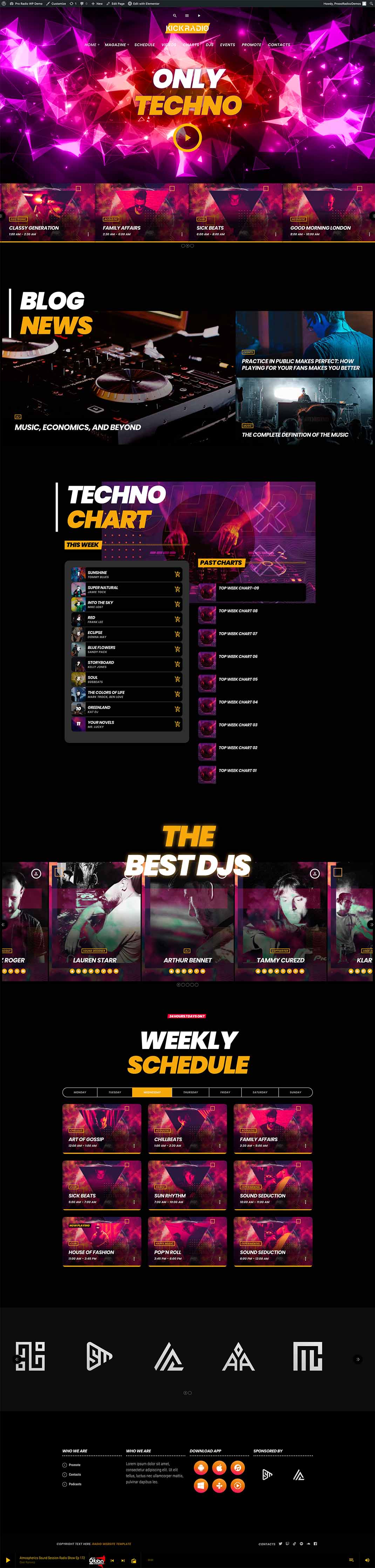 These new radio station templates are included in the demo 6 and part of the Pro Radio theme for WordPress, included in the normal license price. Featuring 6 special templates built with Elementor, and many other custom Elementor pages to display podcasts, radio shows schedule, djs, news and more. The home page features a video background, perfect to attract your listeners and increase the interaction with your website. It has news, charts, schedule, djs and anything else you need for a perfect techno radio station! Create your radio station today!