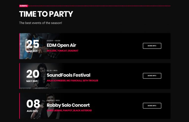 Add events as Hero events, events list, events cards, carousels and countdowns.