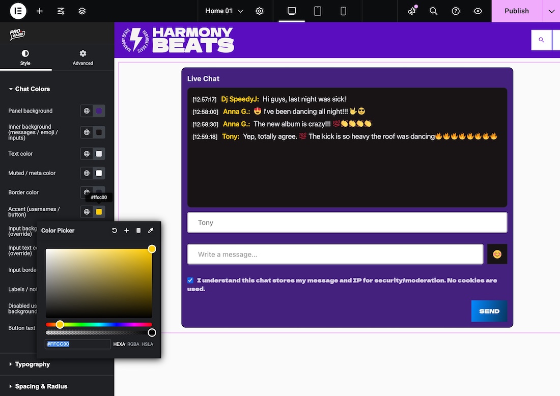 Directly from Elementor, you can adjust colors, fonts, and layout in just a few clicks — making the chat fit your station’s style.