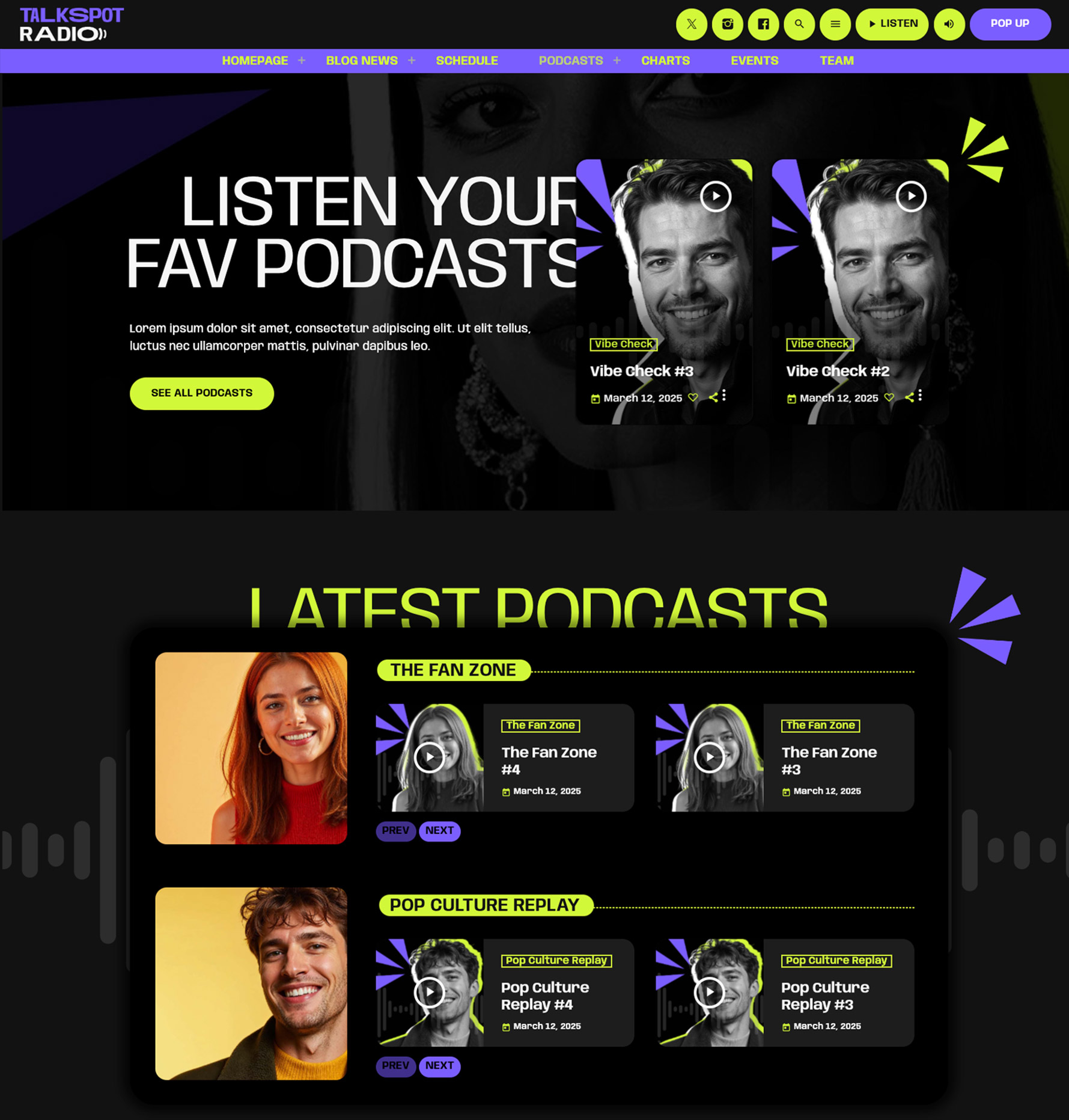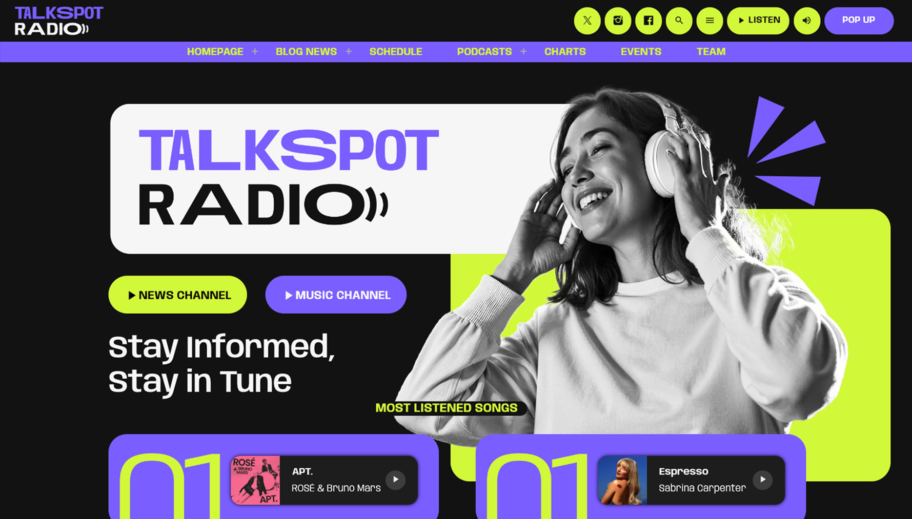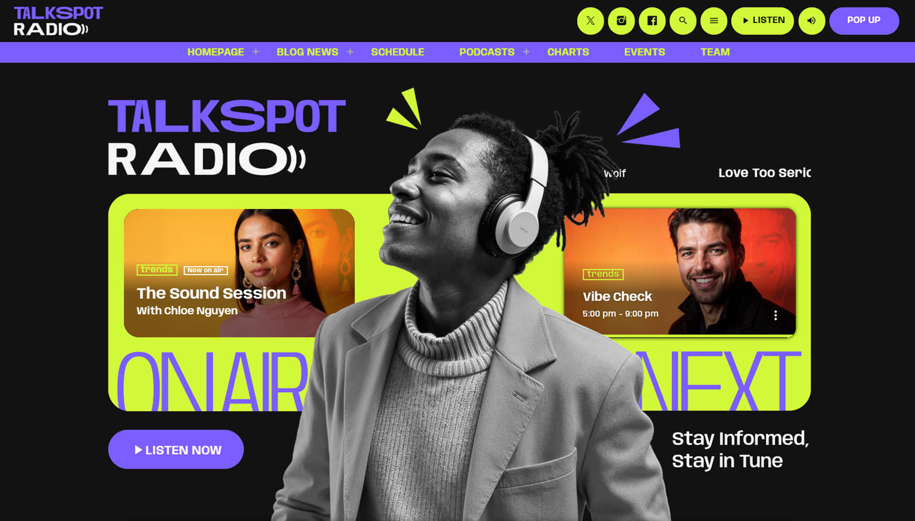 Envision a radio station website that radiates vibrancy—TalkSpot is bold and dynamic. Featuring striking bold color accents, modern typography, and immersive visuals, this template is built to captivate audiences from the moment they land on your site. Designed to reflect the rhythm of contemporary music and broadcasting, TalkSpot seamlessly combines high-energy aesthetics with professional layouts and interactive features, ensuring an engaging experience for every listener.