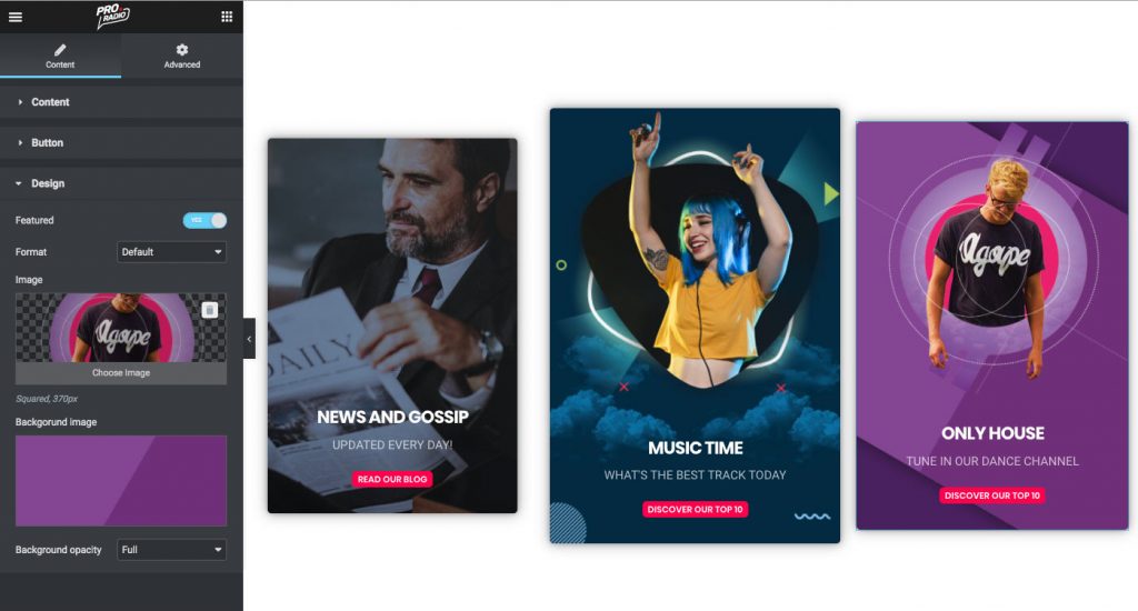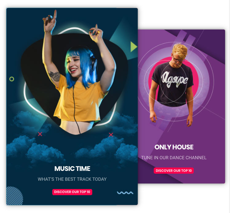 Highlight important actions, link to specific website sections or music categories, entertain and engage. The custom cards are a unique and useful to help your visitors find the right contents.