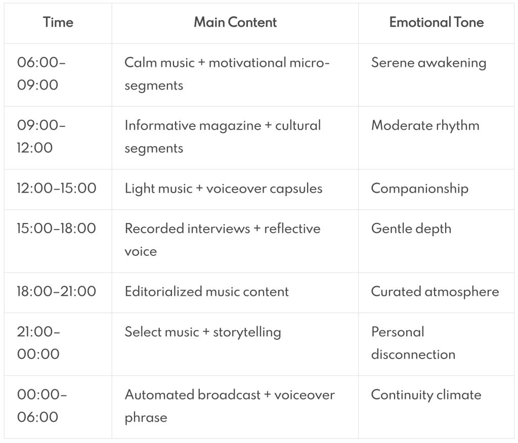 A well-designed schedule goes unnoticed, but it’s felt. It makes the listener stay a bit longer. Come back tomorrow. Feel like they’re listening to something alive, that breathes, that moves with purpose.