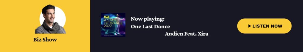 - A custom radio player created in Elementor, displaying the play button, current song and artwork, and the current radio show with its thumbnail