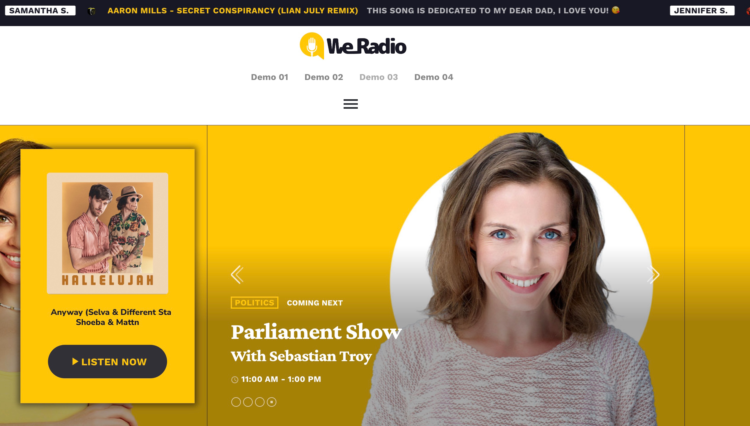 This demo boasts a unique header that includes a shows slider and a custom-built radio player card. This card showcases the current song playing, accompanied by its album artwork for an immersive listening experience. In addition, the song dedications are prominently displayed at the top of the site with eye-catching animated text.