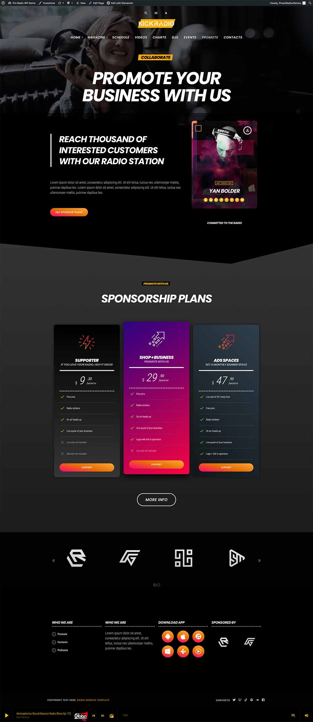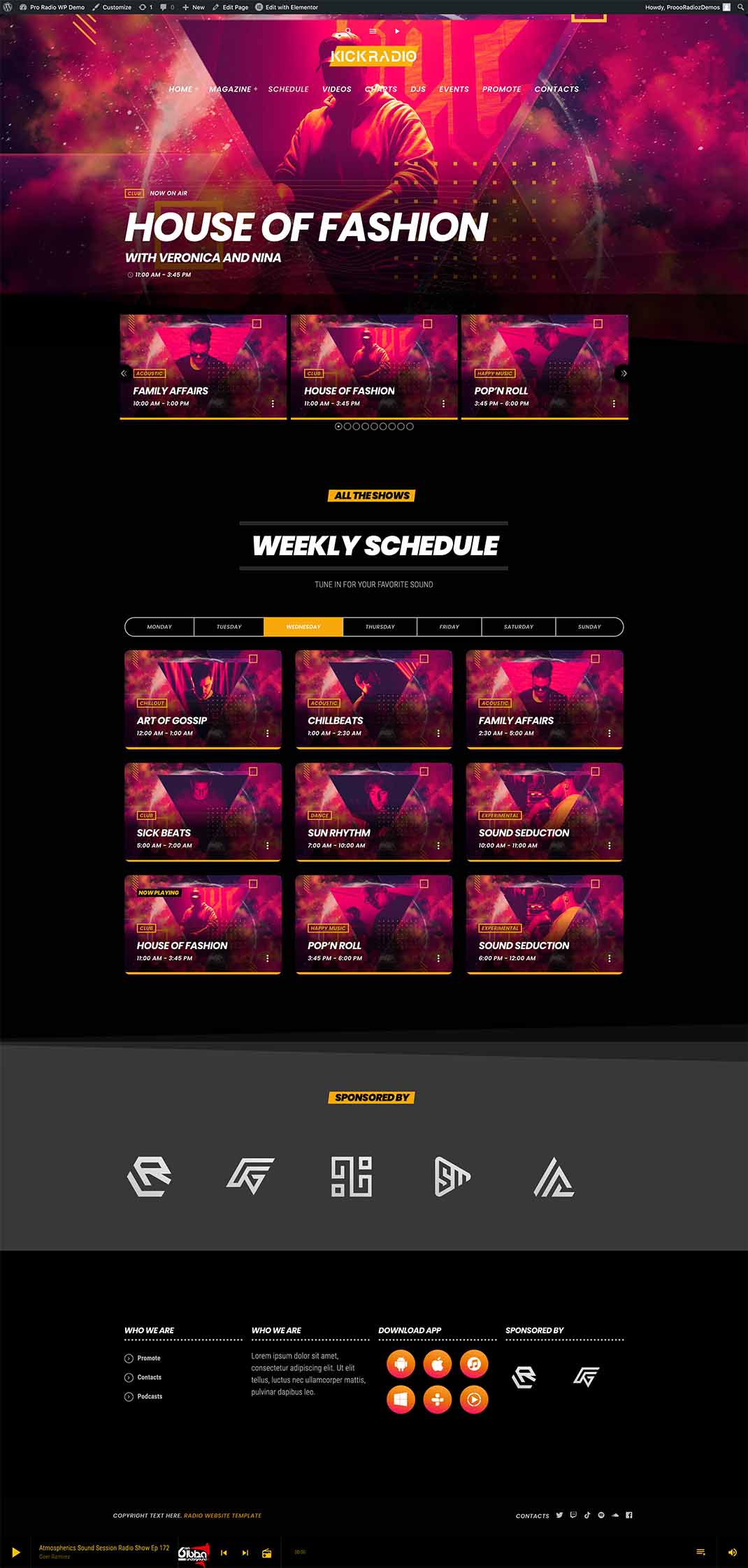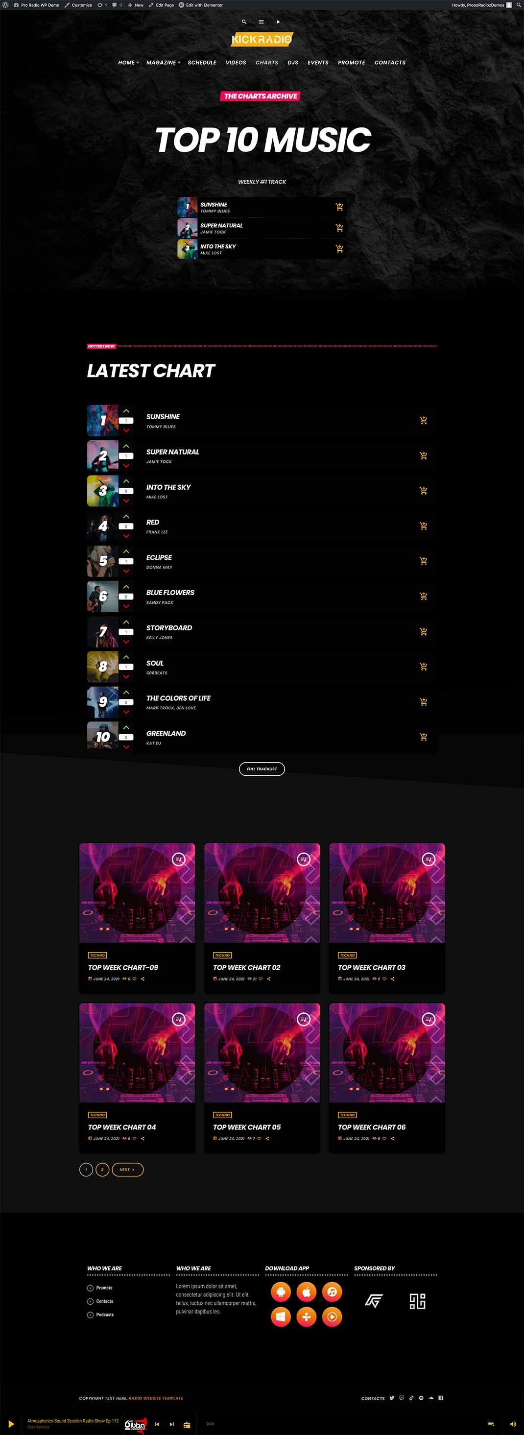 The new techno radio demo features many custom Elementor page templates with lots of radio station Elementotr widgets, like radio shows, schedule, charts, podcasts and events archives, you can check this link.