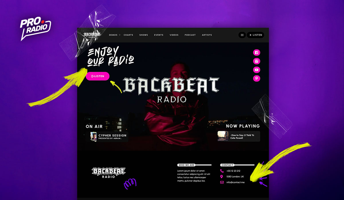 BackBeat Radio boasts a design that seamlessly blends captivating visuals with the electrifying energy of hip-hop. Imagine your listeners feeling instantly connected to the underground scene the moment they land on your site. Graffiti art explodes across the screen, creating a dynamic and immersive experience. The website becomes more than just a platform; it becomes a visual representation of the music itself.