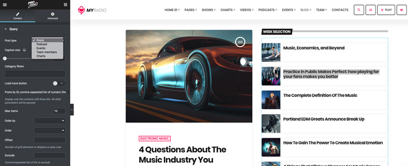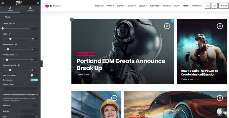 You can also build a totally custom Magazine-style blog page using only Elementor and the multitude  of Elements for blogging added by the Pro.Radio WordPress Theme.