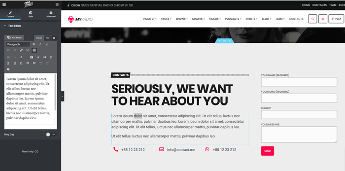 The Pro.Radio WordPress Theme is compatible with the powerful Contact Form 7 plugin, to easily add unlimited contact forms to your pages.