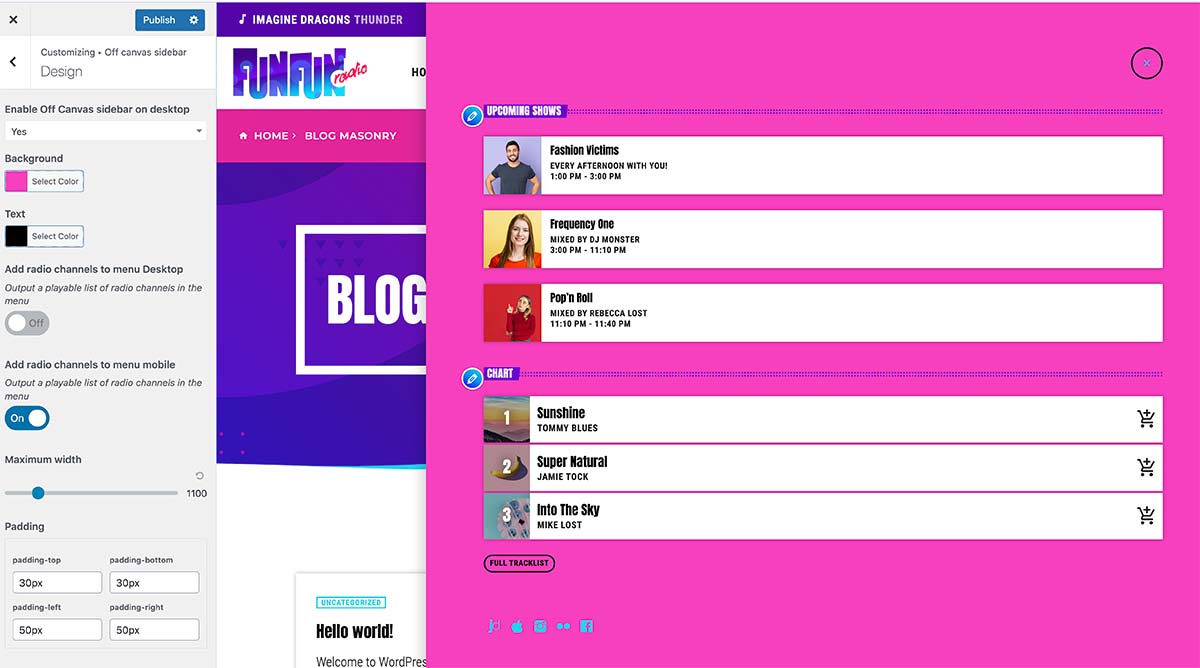 From the WordPress live customizer you can now choose a new Off Canvas section, and customize the design options for the slide-in sidebar. Among the options you can choose, there are background, text color, radio channels list, size and padding.