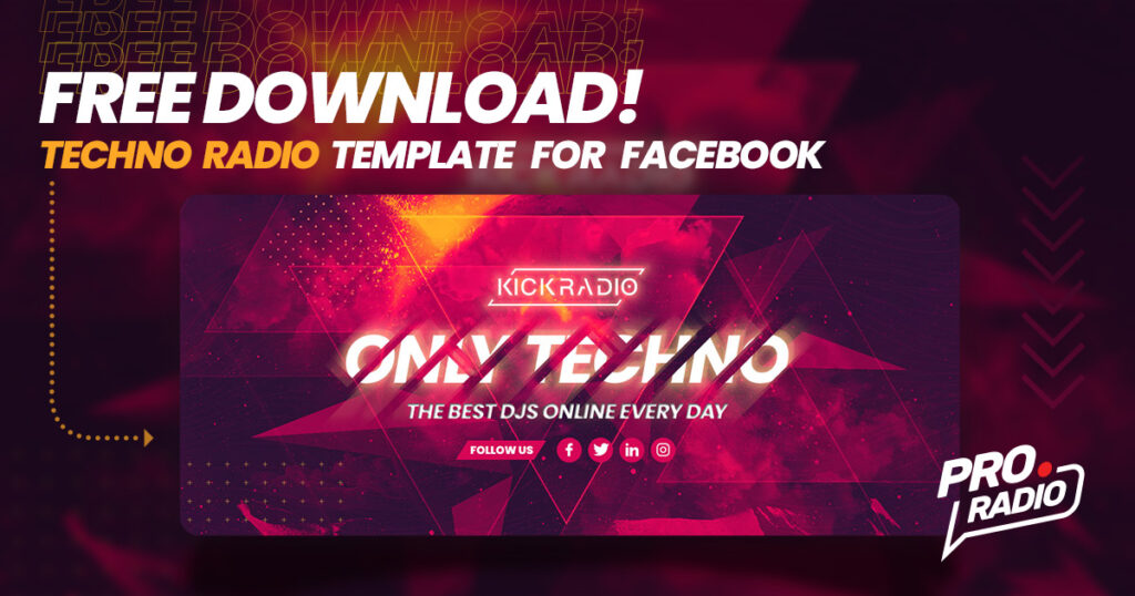 Perfect to create your radio station Facebook header, easily replace your logo, text and social networks. The modern abstract design has the perfect colors blend for a dark techno radio station, and the template file comes with the perfect size for mobile and desktop.