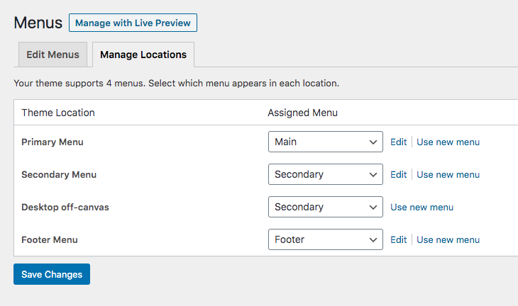 The Off-Canvas sidebar will automatically display the main menu in mobile and, optionally, can hold an extra menu for desktop, selectable from your customizer or from the Menu settings.