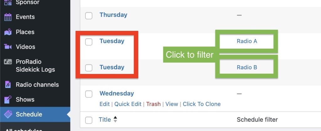 The schedule filter taxonomy is now available from the Admin radio schedule archive. Just click on a Filter, to display only the Schedule days of that specific Schedule Filter.
