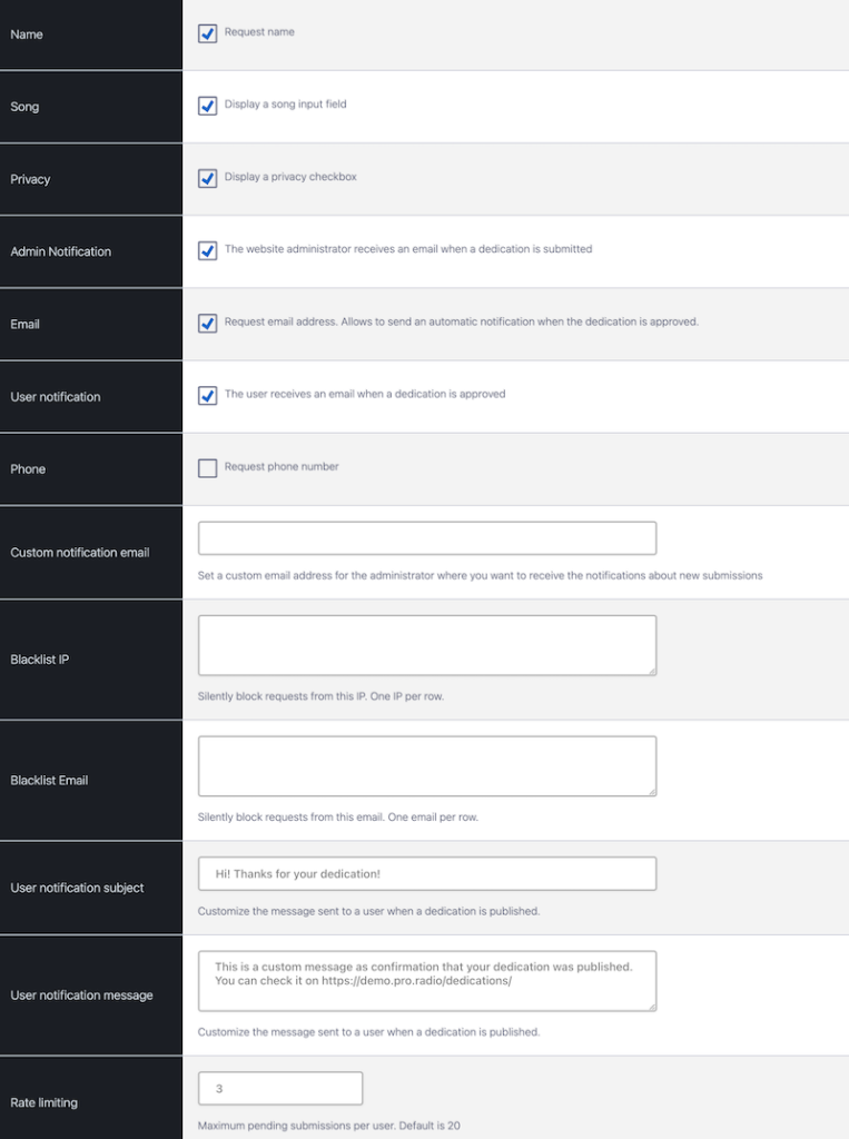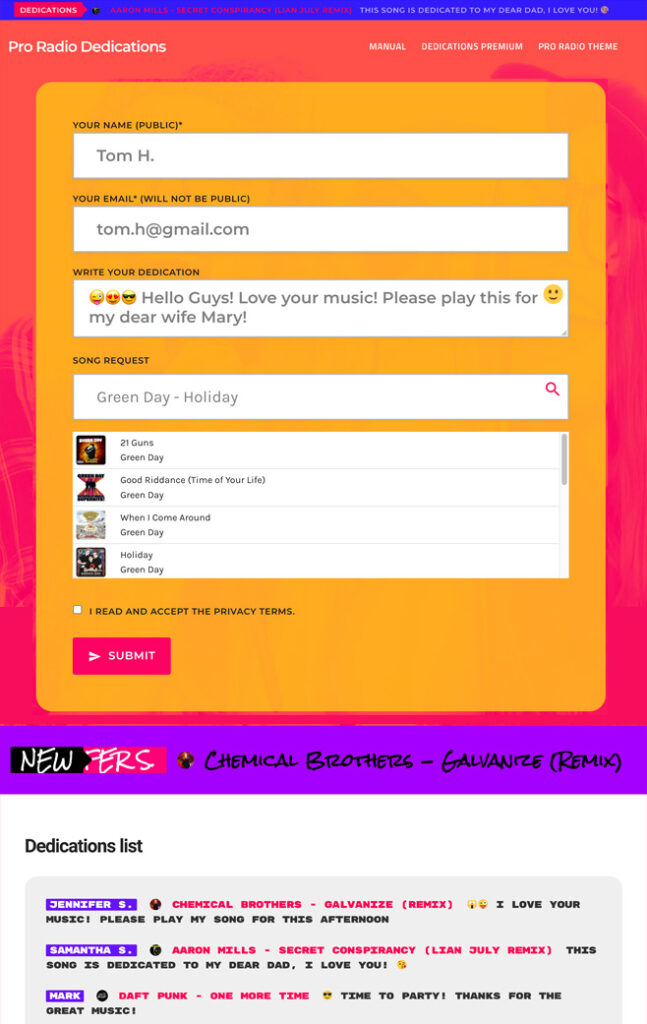 The Pro Radio WordPress Theme comes with Dedications "freemium" .