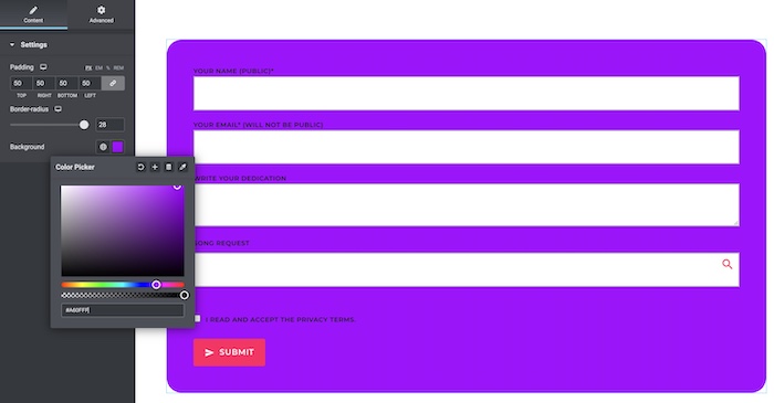 Display and customize the form and the dedications wherever you want with Elementor. Optionally display dedications in the website Secondary header.