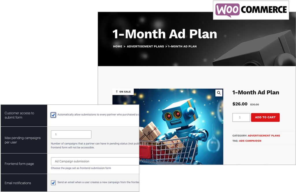 Create virtual products with WooCommerce linked to Ad Campaigns to sell automatically.